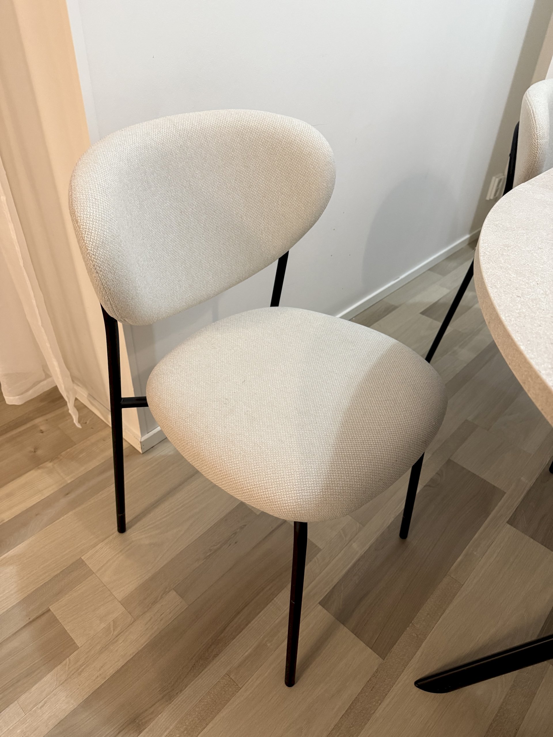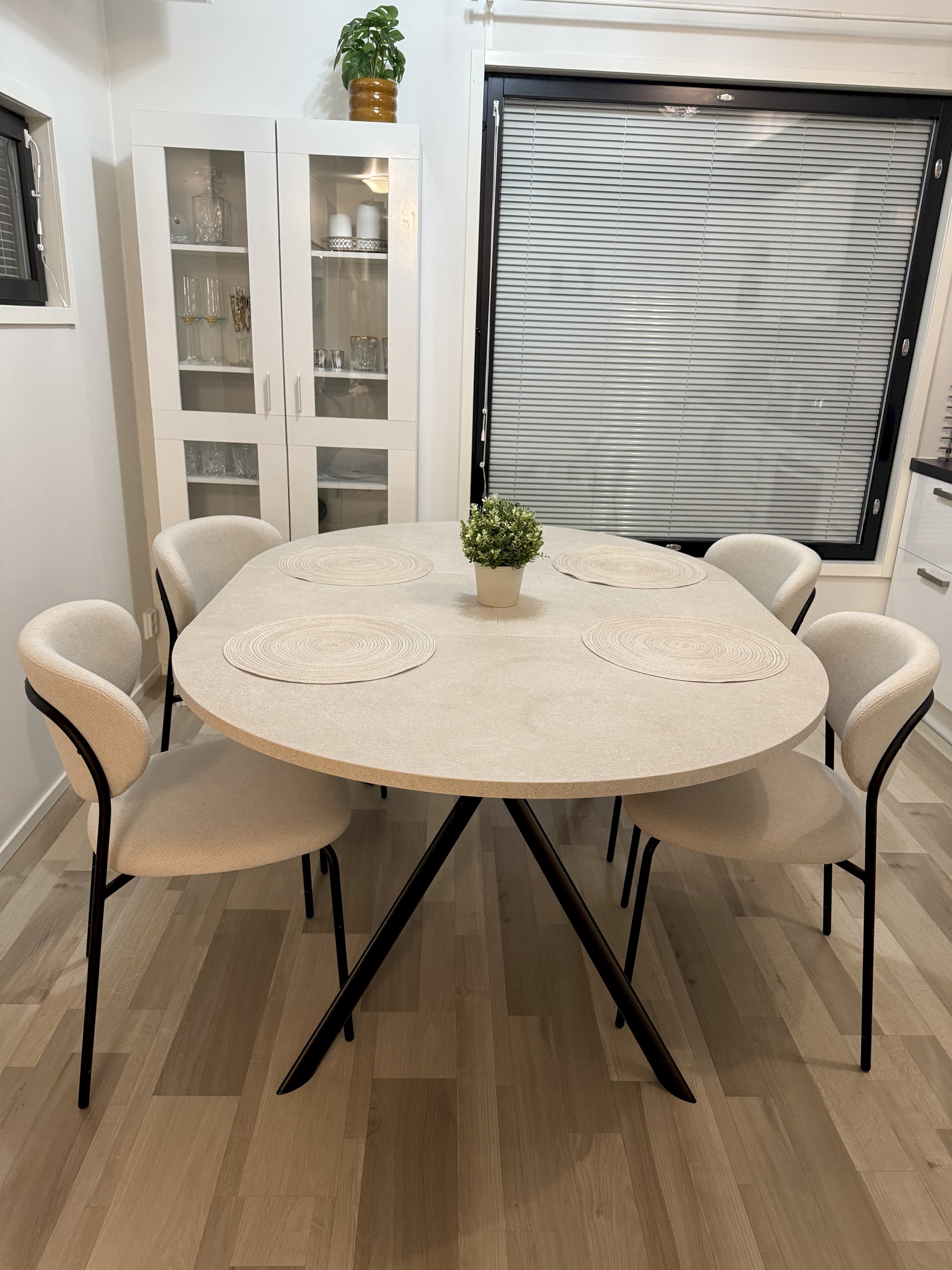 Kyseinen pöytä ja saman sarjan Cozy tuolit.