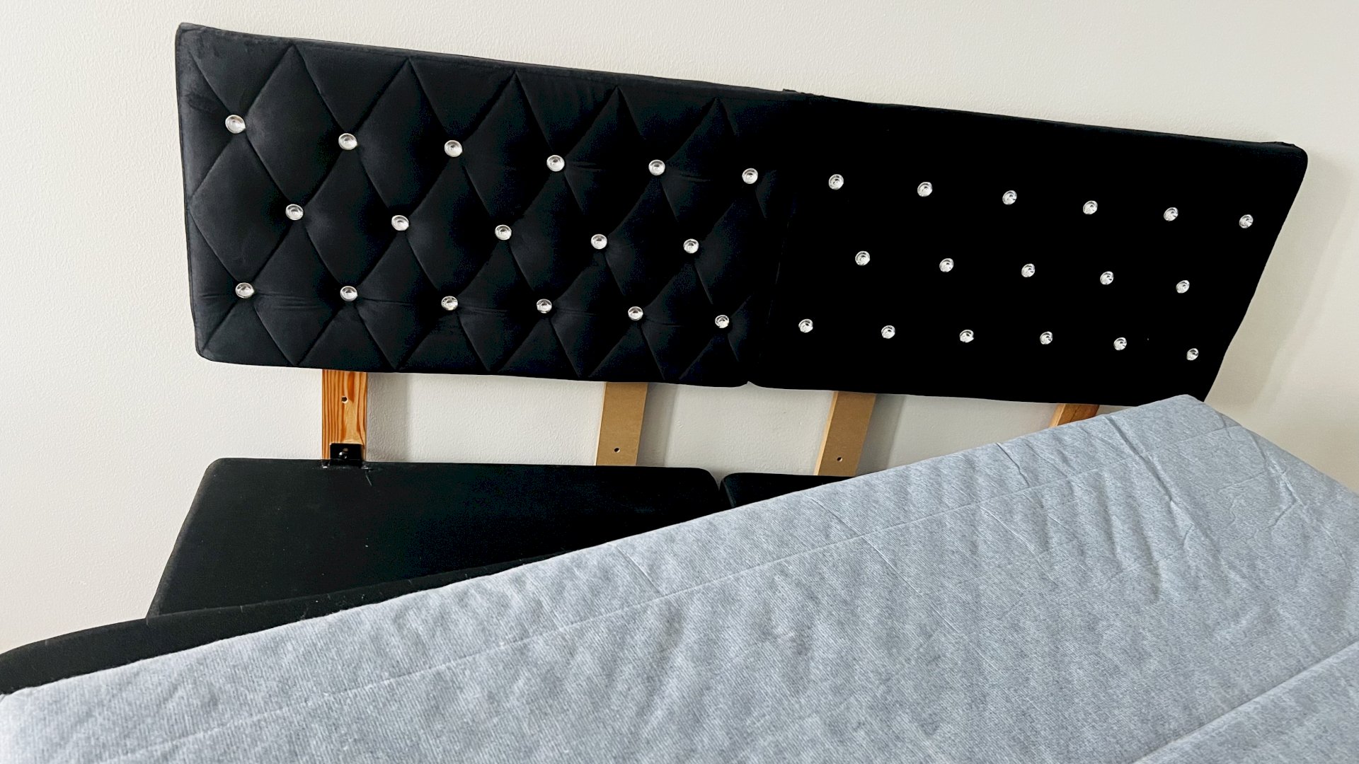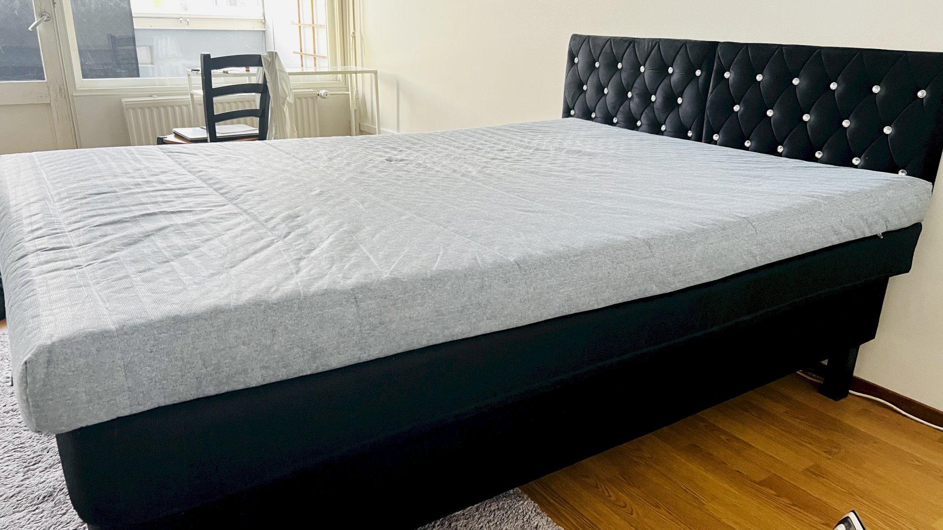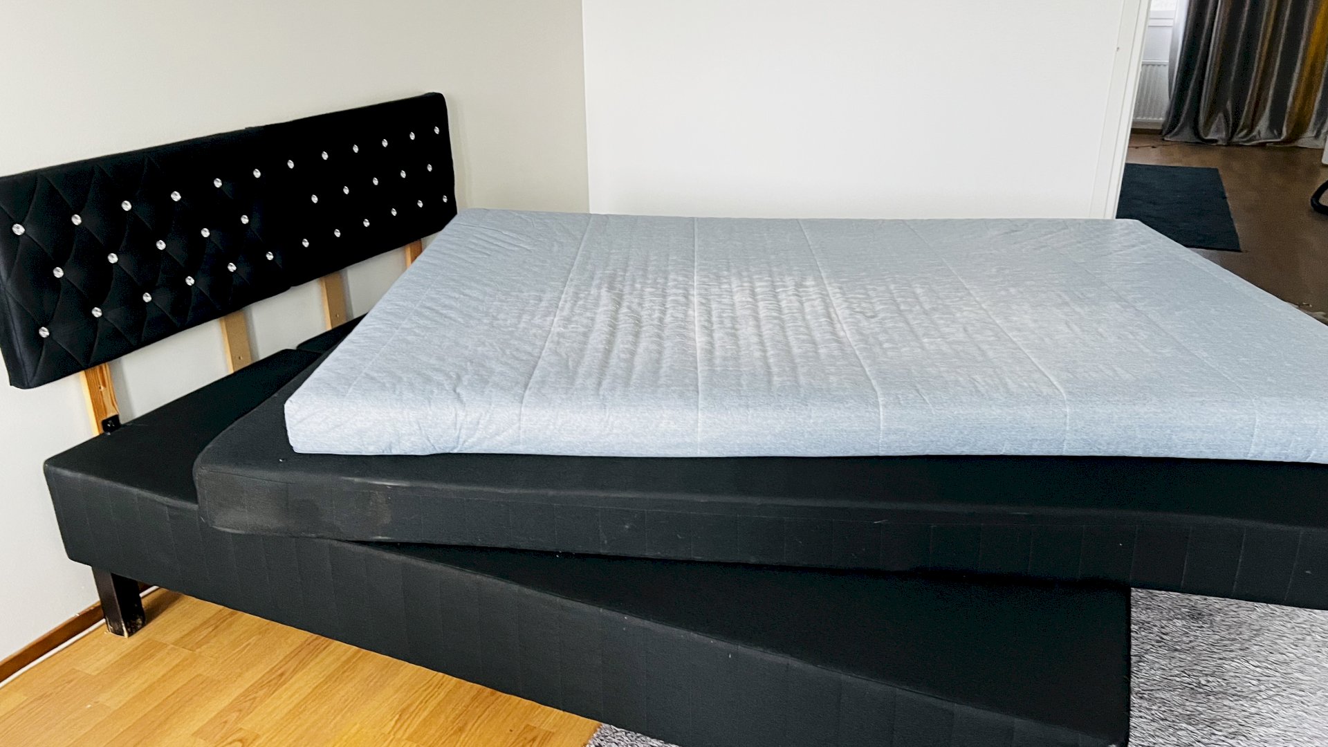 Ikea Bed frame, size 140x200 cm, Bed with a grey mattress and a black frame. Mattress size. The frame is made of durable materials and is suitable for a double bed. The frame is designed to support the mattress evenly and provides a stable base for sleeping. Bed, headboard and mattress topper.