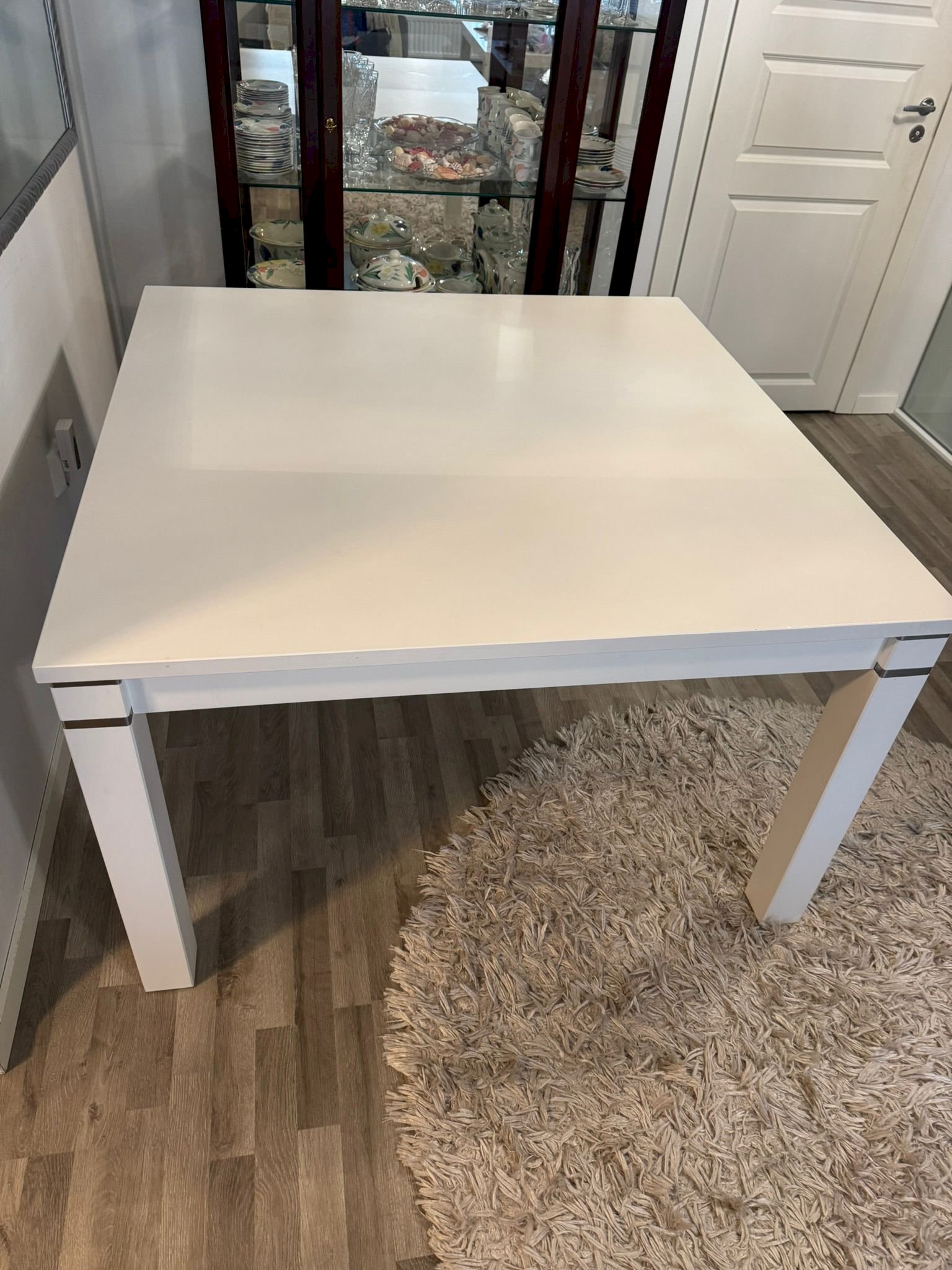 Myydään upea, käsityönä suunniteltu valkoinen ruokailupöytä, jonka on suunnitellut puuseppä. Pöytä tuo kotiisi tyylikästä ja ajattoman kaunista ilmettä, ja sen 120cm × 120 cm koko sopii niin arkeen kuin juhlaan.